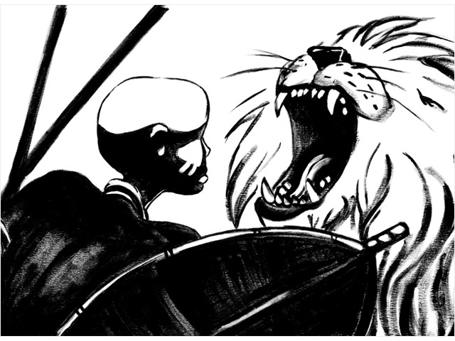 이 그림책이 주는 강렬함은 흑과 백만으로 표현한 힘 있는 그림의 역할이 크다. 티에리 드되는 서로의 목숨을 걸고 맞서는 소년과 사자 이야기라는 긴박한 내용과 어울리게, 검은 아크릴 물감을 묻힌 큰 붓으로 야쿠바와 키부에의 모습을 긴장감 있게 그렸다. 숨죽여 기다리는 야쿠바 앞에 나타난 사자는 큰 판면 가득히 으르렁거리고 있고, 바로 다음 장면에서는 창을 들고 고함을 치며 사자에게 달려드는 소년의 모습이 클로즈업 되어 있다. 작가는 굵고 거침없는 선으로 화면 가득 역동적인 상황을 표현한다.