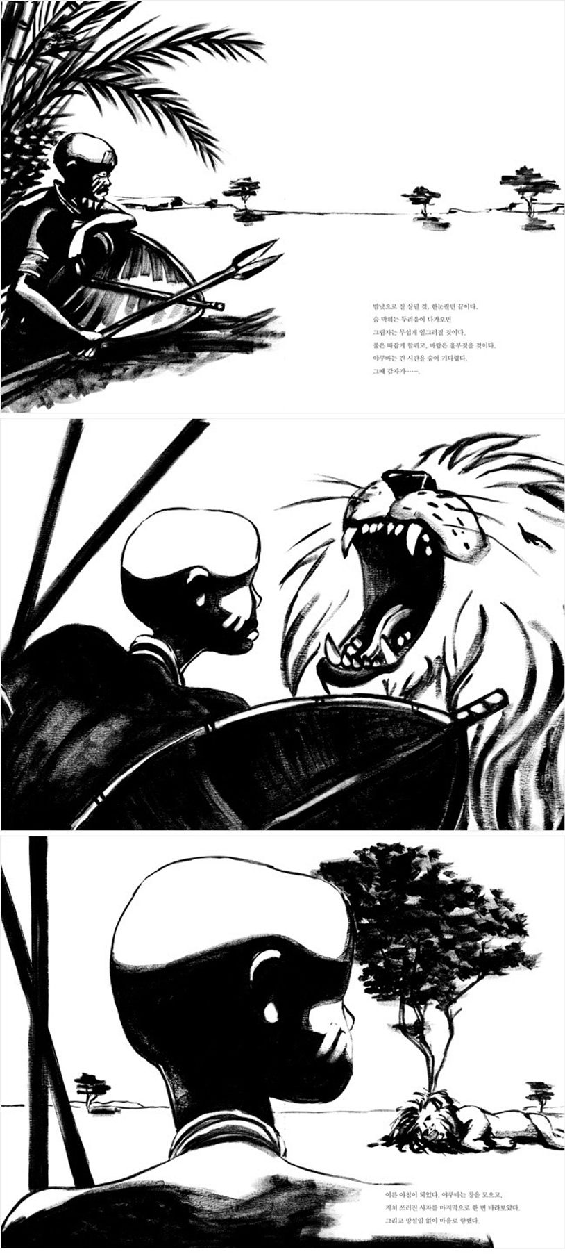 이미 다친 사자를 죽여 인정받는 전사가 되어 사랑받을 것인지, 사자를 살리고 용기없는 남자가 되어 따돌림을 받을 것인지 생애 가장 중요한 선택과 맞닥뜨리게 된 야쿠바를 중심으로 이야기를 진행시켜나가고 있다. 세상을 살아가면서 맞닥뜨리게 될 중요한 가치를 스스로 되짚어보도록 이끈다. 특히 '용기' 속에 숨겨진 진실된 가치에 대해 일깨우고 있다. 캔버스에 검정색 아크릴 물감을 묻힌 붓으로 그려낸 강렬한 흑백 그림이 아이들은 물론, 어른들의 마음까지도 사로잡는다. 감각적 이야기가 지닌 긴박함과 캐릭터가 내뿜는 긴장감을 거침없이 그려내고 있다. 나이가 들었지만 아직 진정한 용기에 대해 잘 모르겠는 어른들에게도 깨달음을 안겨줄 것이다.