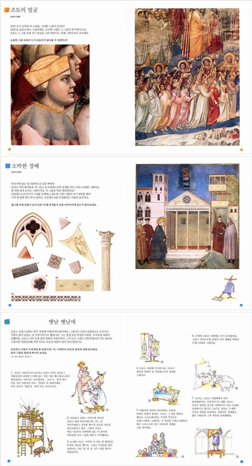 이 책에는 소개된 조토의 <소박한 경배>, <아레조에서 쫓겨나는 악마들>, <가나의 혼인 잔치>, <최후의 심판> 등의 벽화를 통해 아이들은 700년 전의 생활 모습을 살펴볼 수 있고, 회반죽 벽에서 묻어나오는 색감을 느낄 수 있습니다.