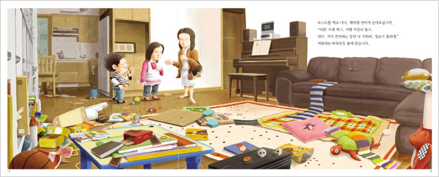 엄마가 잠시 외출하신 사이, 지원이와 병관이는 마냥 신이 났습니다. 바둑알을 가져다가 알까기도 하고, 세계일주 놀이도 하고, 맛있는 토스트도 챙겨 먹고요. 마음껏 노는 동안 집 안 여기저기는 장난감과 책, 과자로 잔뜩 어질러집니다.