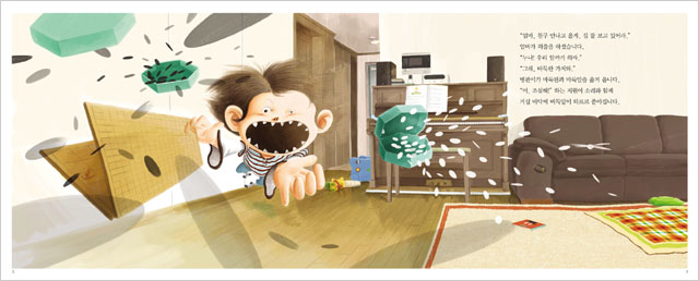 특히 이번 『집 안 치우기』에서는 다양한 소품들 하나하나를 세밀하게 표현하는 그림 작가의 특징이 잘 살아 있습니다. 누나와 함께 알까기를 하고, 토스트를 먹는 중에도 병관이는 바둑알통을 엎고, 장난감 상자를 무너뜨리고, 잼을 흘리며 연방 귀여운 실수를 합니다. 그림 작가는 그렇게 어질러진 집 안 풍경, 곳곳에 흩어져 있는 장난감 하나하나까지 놓치지 않고 공을 들여 세세하고 재미있게 표현해 그림 보는 즐거움을 더합니다. 모형 장난감인 피규어 모으기를 좋아하는 작가의 취미까지 더해져, 이런 집 안 풍경은 실제 공간을 옮겨 놓은 듯합니다.