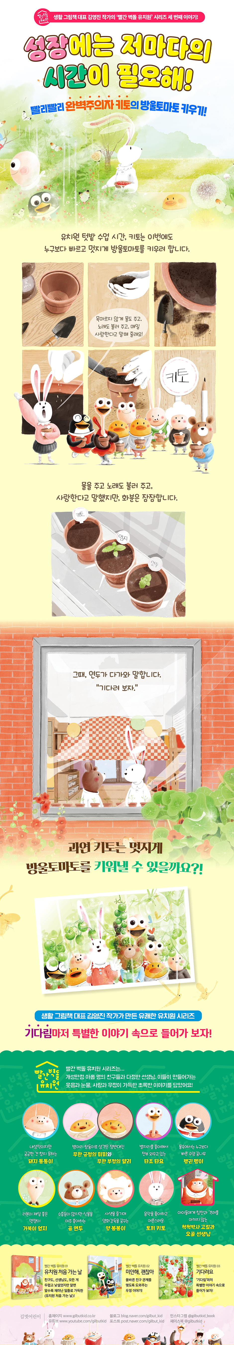초록반 친구인 연두는 식물을 좋아하고 속이 깊은 아이입니다. 하지만 행동이 느리고 자신감이 없어서 발표할 때 곧잘 말을 더듬지요. 키토의 눈에 그런 연두는 무척 답답해 보였습니다. 그렇지만 식물 보약을 준 뒤에 방울토마토에 생기가 돌자, 키토는 연두의 ‘기다려 보자’는 말에 귀를 기울이게 됩니다. 심지어 매일같이 조금씩 자라는 방울토마토를 관찰하며, 점점 기다리는 시간마저 즐거워하게 되지요. 시간이 지나 잘 자란 방울토마토 모종을 유치원 텃밭에 옮겨 심는 날, 햇살 아래 눈부시게 반짝이는 식물들처럼 키토와 연두의 표정도 환하게 빛납니다.