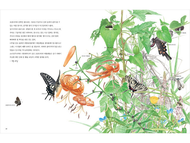 그래서 책장을 넘기다보면 독자들은 여러 꽃과 나비들이 어떤 모습이며, 각기 어떻게 살아가는지 알게 됩니다. 어느 계절에 어떤 꽃이 피어나는지, 주변에 어떤 꽃과 함께 피는지, 그 꽃에 어떤 나비가 자주 날아드는지는 물론 꽃에 담긴 일화나 꽃말도 자연스레 알 수 있습니다. 나비의 경우에도 각기 알을 낳는 곳과 짝짓는 방법, 좋아하는 먹이, 암컷과 수컷의 차이 등 나비마다의 특징을 글과 그림으로 설명하고 있습니다.