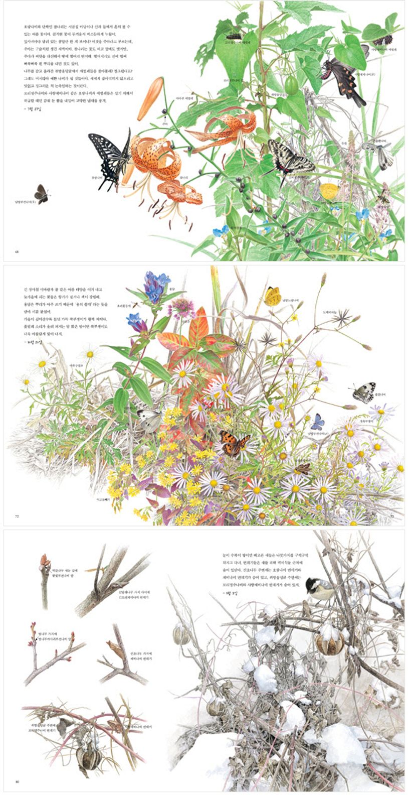 『세밀화로 보는 꽃과 나비』는 봄(14장면), 여름(14장면), 가을(8장면), 겨울(4장면)로, 총 40장면으로 구성되어 있습니다. 이러한 계절의 변화와 흐름을 바탕으로 작가는 우리 산과 들에서 만난 자연의 모습과 생명들이 살아가는 이야기를 담아냈습니다. 작가는 한 장면 한 장면마다 알려주고 싶은 꽃과 나비의 생태를 세밀한 그림으로 보여주고, 마치 아이들을 앉혀 놓고 이야기하듯이 조근조근 들려줍니다.