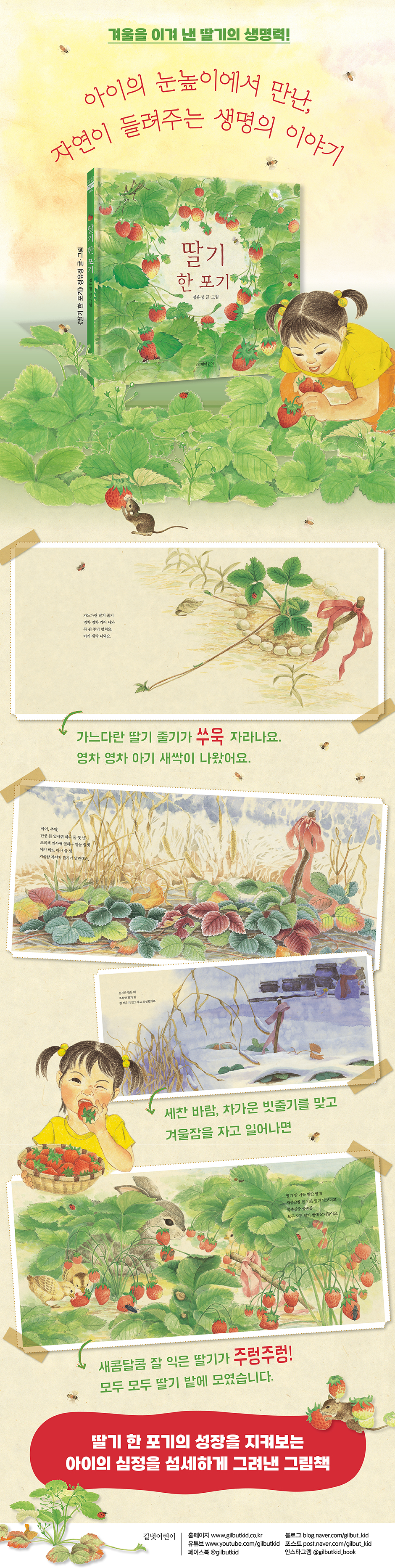 열매를 맺고 난 딸기는 줄기를 뻗어 새 포기를 만듭니다. 새 포기는 그 해에는 열매를 맺지 못하고 추운 겨울을 이겨내고 다음 해 봄이 되어야 열매를 맺습니다. (심은 해에 열매를 맺는 딸기 모종은 겨울을 나는 효과를 내는 처리를 한 것입니다.) 씨앗으로 겨울을 나는 다른 식물들의 지혜도 놀랍지만 잎과 줄기를 단 채로 추운 겨울을 이겨 내는 딸기는 자연의 놀라운 생명력을 잘 보여 줍니다. 이 책에서 딸기의 생명력은 아이의 관심 속에서 피어납니다. 조약돌 울타리와 막대기에 묶어 놓은 빨간 리본이 딸기를 향한 아이의 마음을 나타냅니다. 아이가 설정한 울타리를 넘어서 자신의 생명력을 한껏 펼치는 딸기는 주어진 한계에 갇히지 않고 날마다 자라는 어린이의 모습 그대로이기도 합니다. 아이는 딸기가 줄기를 뻗어 새 포기를 만들고 추운 겨울을 넘기고 봄을 맞아 열매를 맺는 것을 지켜보면서 또 한 살을 먹습니다.