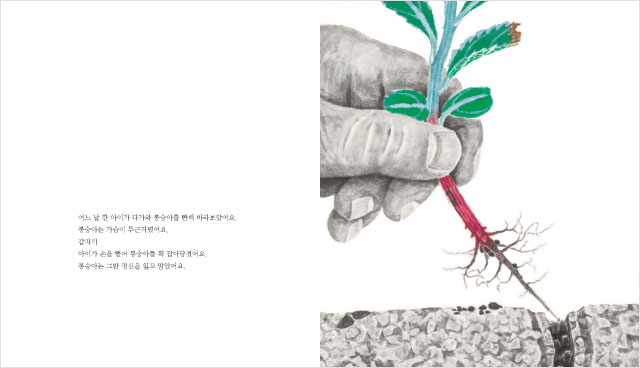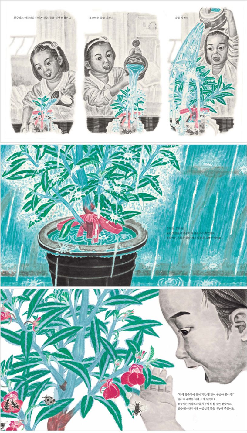 꽃을 피우거나 하기 전에는 눈에 잘 띄지 않는 식물의 일생이 작가의 손을 거치면서 감동적인 드라마가 되었습니다. 단색 수묵으로 그린 배경에 초록으로 싱싱하게 빛나는 봉숭아가 생명의 환희를 노래하는 듯합니다. 이 책의 작가는 봉숭아가 싹을 틔우고 자라고 꽃을 피워 열매 맺는 과정을 한 존재가 역경을 이겨 내고 꿈을 이루는 삶으로 그려 내고 있습니다. 그저 아무 변화 없이 날마다 그대로인 듯한 식물의 삶이 이제 새롭게 다가옵니다. 어린이들은 이 책을 읽으면서 봉숭아 꽃처럼 아름답고 다른 이들에게도 기쁨을 줄 수 있는 꿈을 키울 것입니다.