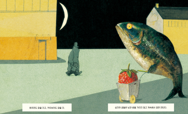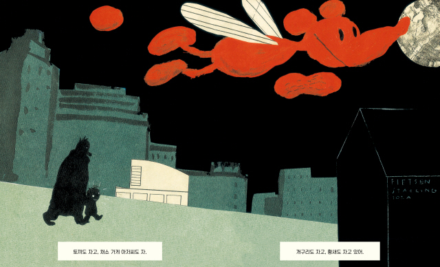 아빠가 자고 있을 거라던 토끼는 항아리 속에 앉아 텔레비전을 보느라 정신이 없고, 튤립 소년은 신나게 롤러스케이트를 타고 지나가네요. 이렇게 폰스가 깜깜한 한밤중의 소란함을 즐기고 있을 때 하늘에서