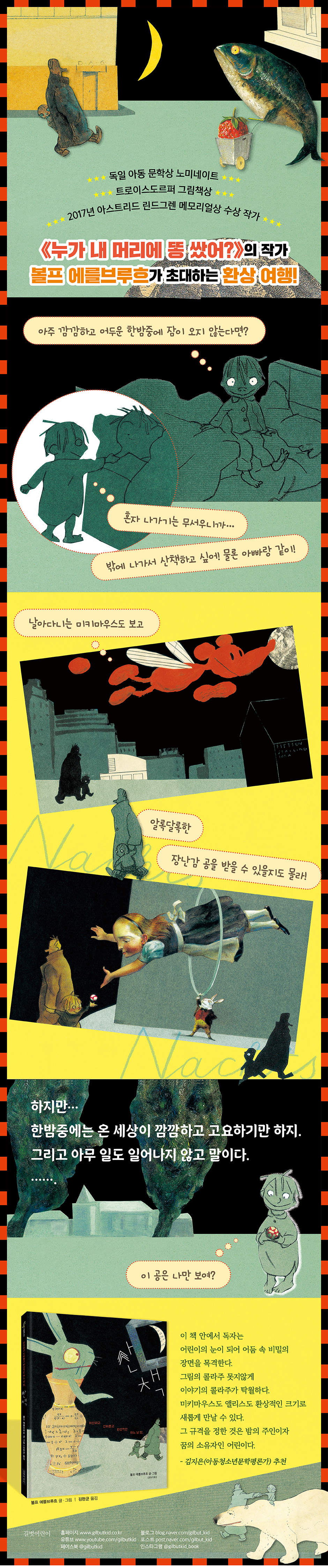 《누가 내 머리에 똥 쌌어?》의 볼프 에를브루흐는 지도와 수학 공식이 적힌 종이를 오려 붙이고 그림도 그리며 콜라주 기법을 통해 환상과 현실 세계가 공존하는 듯한 기묘한 세계를 보여줍니다. 그리고 밤이 되면 더욱 세상이 궁금한 아이들의 마음을 이해하고, 아이들이 꿈과 환상의 세계에서 경험한 모든 것들을 누릴 자격이 있다고 이야기하지요. 《이상하고 신비롭고 환상적인 어느 날 밤, 산책》을 통해 무궁무진한 한밤의 세계를 여행해 보세요!