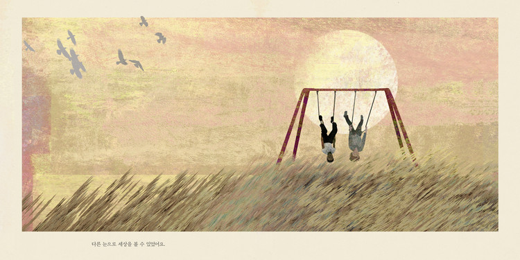 브리타 테켄트럽은 추억의 조각을 모으듯 콜라주와 판화 기법을 사용해 특별한 장소에서 경험했던 아름다운 시간들을 화면에 수놓습니다. 그네를 타는 사람들의 모습뿐 아니라 그네를 타며 한 번쯤 떠올렸을 법한 상상, 그네를 타며 바람을 느끼고 자연을 온몸으로 느꼈던 잔상까지 세세하게 표현하여 그네가 주는 또 다른 즐거움을 보여 주어요.