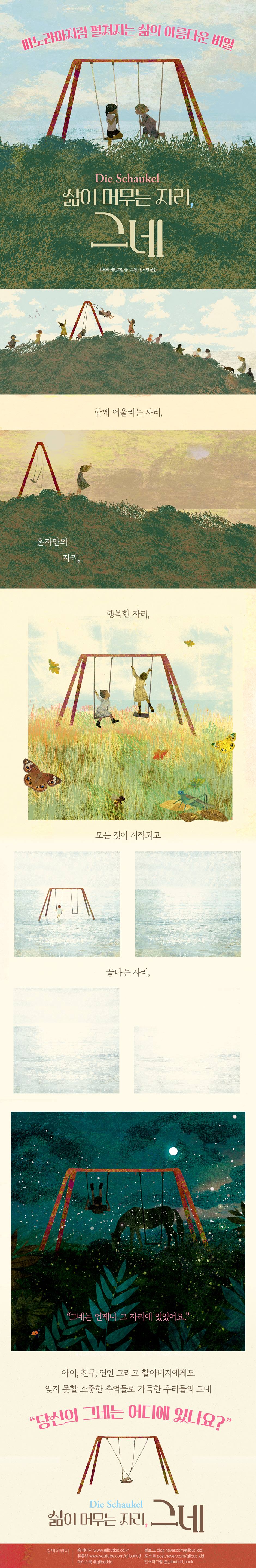 바다가 보이는 언덕 위가 아니어도, 우리 일상 속에 발길이 닿는 곳 어디든 그네가 있어요. 집에서 나와 학교로 향하는 길목에, 학원이 끝나고 집으로 돌아가던 중에 언제든 놀이터에 놓인 그네에 앉아 잠시 머물다 갈 수 있어요. 어쩐지 집으로 들어가고 싶지 않을 때 우리는 그네에 앉아 도란도란 이야기를 나누고, 사랑하는 이와 이별한 뒤에도, 그리고 힘든 하루 끝에도, 그네에 앉아 발아래로 툭툭 떨어지는 눈물 자국을 발로 쓱쓱 지워 감추기도 해요. 그러다 보면 어느새 가벼워진 마음이 찾아오기도 하지요.
