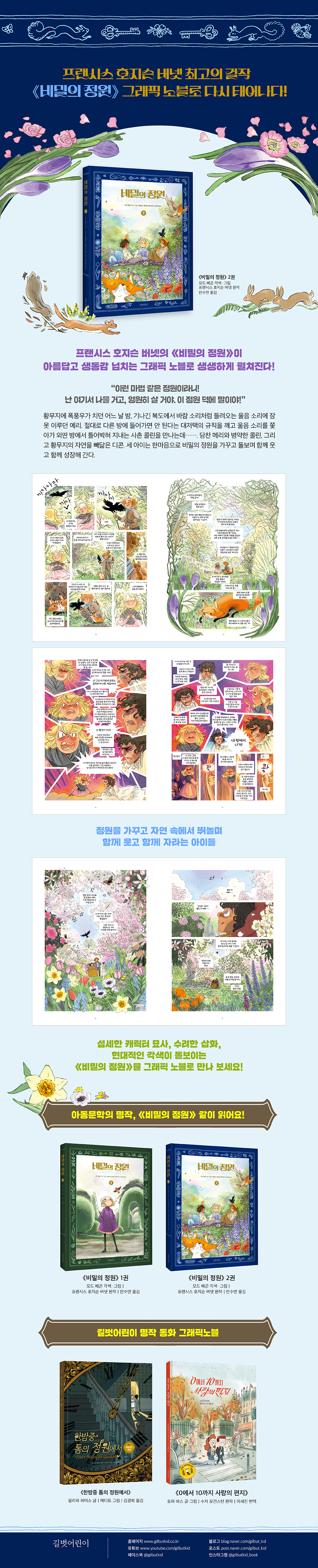 〈비밀의 정원〉은 이기적이고 제멋대로이던 한 소녀가 아름다운 정원과 마음을 나눌 수 있는 친구들을 만나며 밝고 건강한 모습으로 자라는 과정을 담은 성장 소설이다. 프랜시스 호지슨 버넷의 대표작이자, 최고 걸작으로 평가를 받는 «비밀의 정원»을 프랑스의 만화가 모드 베곤이 오늘날의 독자들을 위해 각색하여 세밀한 묘사와 아름다운 삽화가 돋보이는 그래픽 노블로 다시 탄생시켰다. 이 작품은 1911년 처음으로 발표된 이후 세계 각국에서 출판되어 온 것은 물론이고 연극, 영화로도 수차례 만들어지며 여전히 전 세계인의 뜨거운 사랑을 받고 있다. 섬세한 캐릭터 묘사, 수려한 삽화, 현대적인 각색이 돋보이는 〈비밀의 정원〉을 그래픽 노블로 만나 보자.