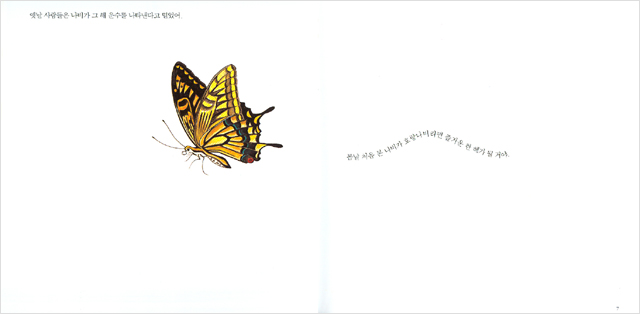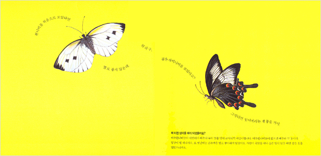 이러한 좋은 그림책 문장의 본보기가 되는 책으로 <봄날 호랑나비를 보았니>(길벗어린이 펴냄)를 눈여겨볼 필요가 있다. 이 책은 조선시대 우리나라의 유명한 화가들이 그린 곤충과 꽃 그림의 원화를 이용하고 있다. 아이들의 감수성이 우리 회화의 전통을 자연스럽게 흡수하여 이러한 친화력을 징검다리 삼아 자연과 생태계에 저절로 관심을 갖도록 아주 잘 꾸며져 있다.