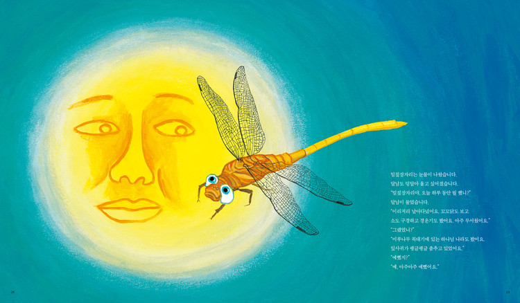 갓 태어난 밀짚잠자리로 표현된 순수하고 맑은 눈, 그리고 그 눈에 비친 희로애락의 삶은 극적인 대비를 보여 주며 독자의 공감을 이끌어내는 동시에 주제를 한 번 더 강조하고 있습니다. 책 속의 밀짚잠자리를 따라 다양한 동물들, 사람들을 마주치고 여러 가지 상항들을 관찰하다 보면 어느새 우리 자신과 우리 삶의 모습을 떠올리게 되지요.