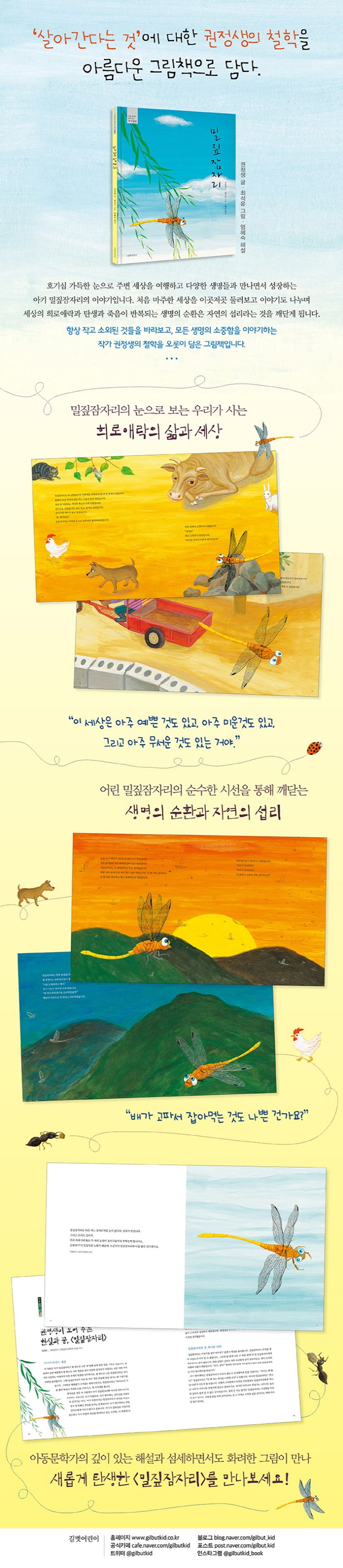 또한 밀짚잠자리의 고민은 작가 권정생이 고민했고 우리 모두가 앞으로도 끊임없이 생각하게 될 ‘살아간다는 것은 무엇일까?’라는 질문과 마주하게 합니다. 아이와 어른이 함께 읽으면서 생명과 삶에 대해 생각해 보고 각자의 생각을 나누어 볼 수 있을 것입니다.