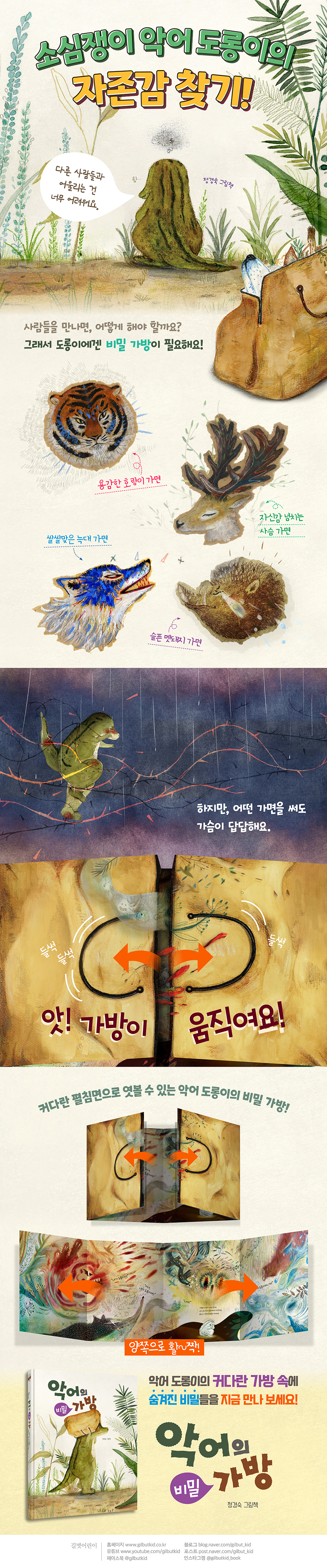 또한 비밀스럽게 꽁꽁 감춰져 있던 도롱이의 비밀 가방은 양쪽으로 활짝 펼쳐지는 펼침 페이지로 구성하여, 가방을 열 듯 책장을 양옆으로 여는 순간, 숨겨져 있던 다양한 동물 가면들을 한번에 볼 수 있습니다. 이러한 극적인 구성은 다양한 동물 가면들 사이에서 자신을 잃어 가며 슬퍼하는 도롱이의 불안하고 혼란한 마음을 극대화하여 표현하고, 책을 읽는 독자들에게는 호기심을 유발합니다. 이제 악어의 커다란 가방 속에 숨겨진 비밀들을 만나 볼까요?