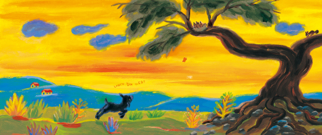 이은경 작가는 아름다운 그림으로 아기 염소의 꿈같은 하루를 더욱 생생하게 그려냅니다. 빛나는 햇살을 받은 듯 형광빛 가득한 아크릴 물감을 사용하여, 아기 염소가 뛰어노는 짙은 초록색 들판과 파란 하늘, 노란 병아리 친구들, 주황빛 노을 지는 하늘 등을 더없이 아름답게 표현했습니다. 한 장 한 장이 멋있고 아름다워 마치 한 편의 예술 작품을 감상하는 듯하지요.