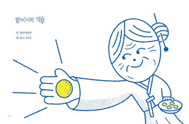 으슥한 산길에서 호랑이랑 딱 마주친 할머니! 당황할 법도 한데 되려 호랑이에게 “안 잡아먹으면 / 떡 하나 주지”라고 당당하게 말합니다. <금도끼 은도끼>의 나무꾼은 연못에서 자꾸 손이 미끄러진다며 “산신령님 또 뵙네요”라고 너스레를 떱니다.