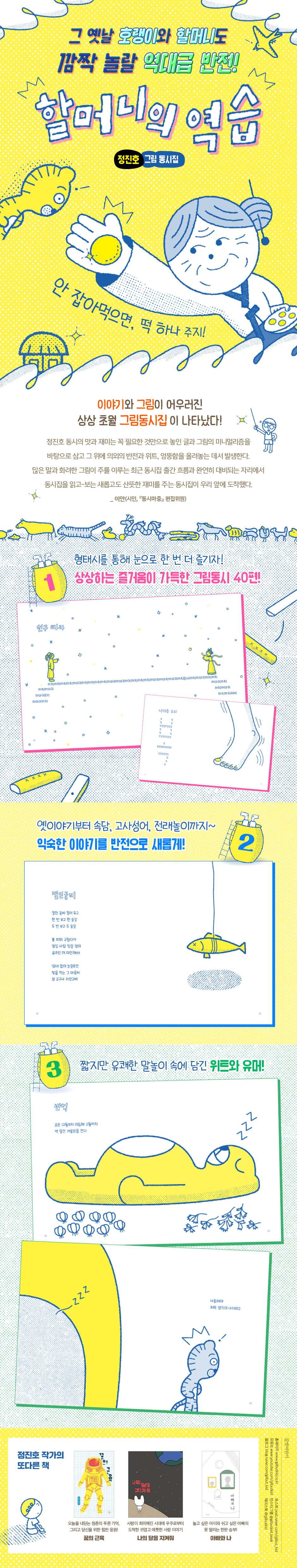 이처럼 글과 그림 전반에 깔린 위트와 유머가 동시 감상의 즐거움을 한층 더합니다. 때로는 재치 있는 농담으로, 때로는 감동적으로 우리의 마음을 적시는 옛이야기 그림동시집 《할머니의 역습》을 읽으며 정진호 작가표 동시를 읽는 재미에 푹 빠져 보세요!