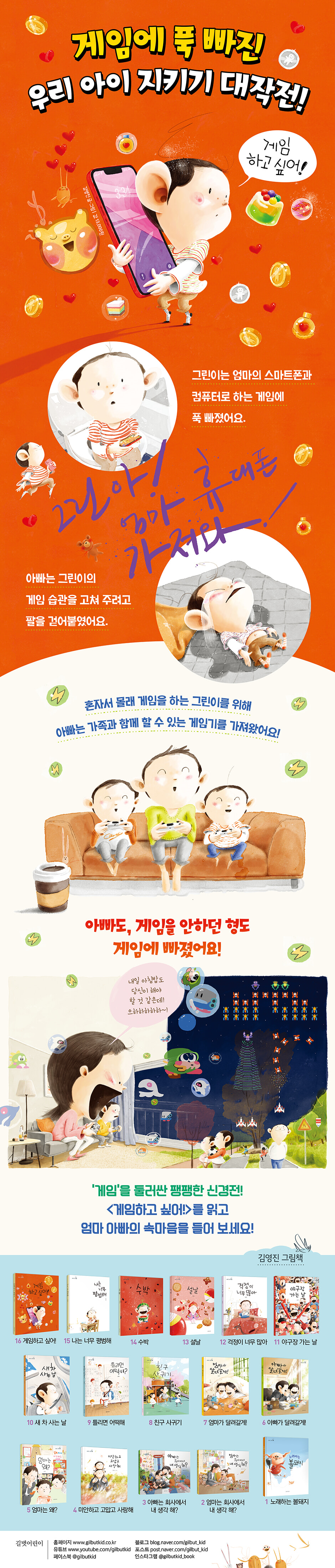 우리 아이, 우리 가족의 이야기를 ‘아빠’의 시선으로 담아 낸 김영진 그림책 시리즈 《게임하고 싶어!》는 게임을 좋아하는 아이들의 솔직한 속마음을 시원하게 들려주며, 독자들에게 큰 재미와 감동을 안겨 주고 함께 생각해 볼 시간을 선물해 줍니다.