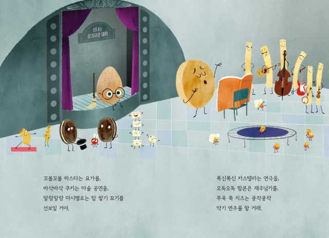 오늘은 수퍼마켓 마을에 장기자랑 대회가 열리는 날이에요. 친구들은 모두 자랑할 재능이 있어 들떠 있지요. 요가를 하는 파스타, 마술을 선보이는 쿠키, 탑 쌓기 묘기를 보여 줄 마시멜로, 연극을 준비한 카스텔라와 악기를 연주하는 치즈까지!