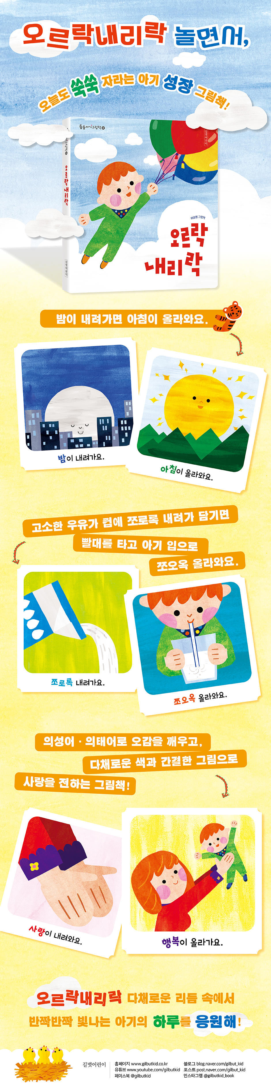 《오르락내리락》은 하루 속에서 아기가 성장하는 순간순간을 담았어요. 내려오면 올라가고, 올라가면 내려오는 반복 구조를 따라 책장을 넘기다 보면, ‘오르락내리락’이라는 움직임의 개념을 익히게 되고 리듬을 타며 마치 놀이하듯, 책 읽는 즐거움을 느끼게 될 거예요.