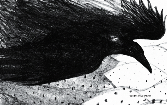 《검은 새》는 석판화로 작업한 것으로, 다른 색은 전혀 사용하지 않고 오로지 흰 바탕과 강렬하게 대비되는 검은색으로만 그림을 그려 이야기를 만들어 나가고 있습니다. 검은색은 때로는 하늘을 뒤덮은 검은 새의 날개가 되기도 하고, 바람이 되기도 합니다. 그리고 하늘을 날 때의 속도감과 아이를 스치고 지나가는 바람의 결로 나타나기도 하지요.