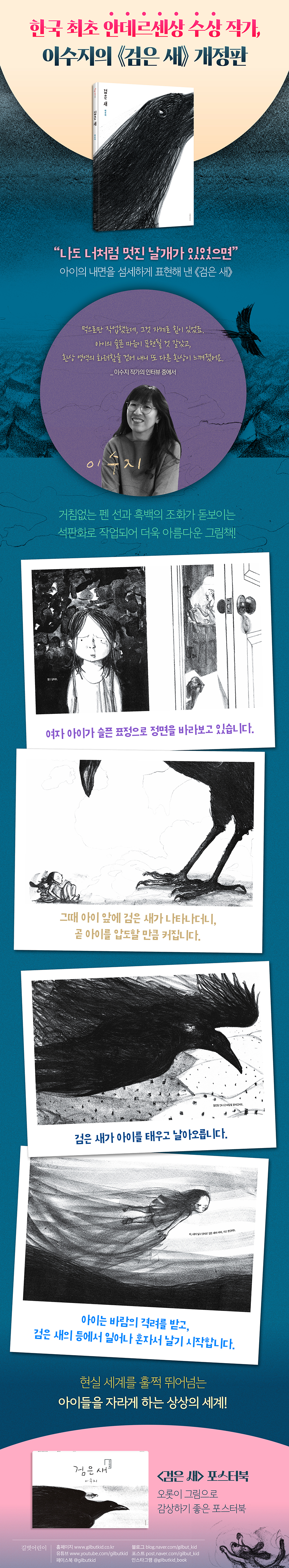 한국인 최초로 2022년 한스 크리스티안 안데르센상을 수상한 이수지 작가의 대표 그림책 《검은 새》가 개정판으로 새롭게 출간되었습니다. 2007년에 첫 출간된 이후로 오랜 시간 동안 독자들에게 꾸준히 사랑받아 온 《검은 새》는 여러 환경 속에서 때로는 불안하고, 때로는 행복한 아이의 마음을 검은색이 아름다운 석판화로 섬세하게 표현해 보여 주고 있습니다. 이번 개정판에서는 석판화 특유의 색감과 질감을 최대한 살려 인쇄하고, 더욱 세련된 디자인으로 소장 가치를 높였습니다. 이수지 작가의 거침없는 펜 선과 흑백의 조화가 돋보이는 그림들이 가득 담겨 있는 《검은 새》로 아이의 ‘상상’의 세계 속으로 함께 떠나 보세요!