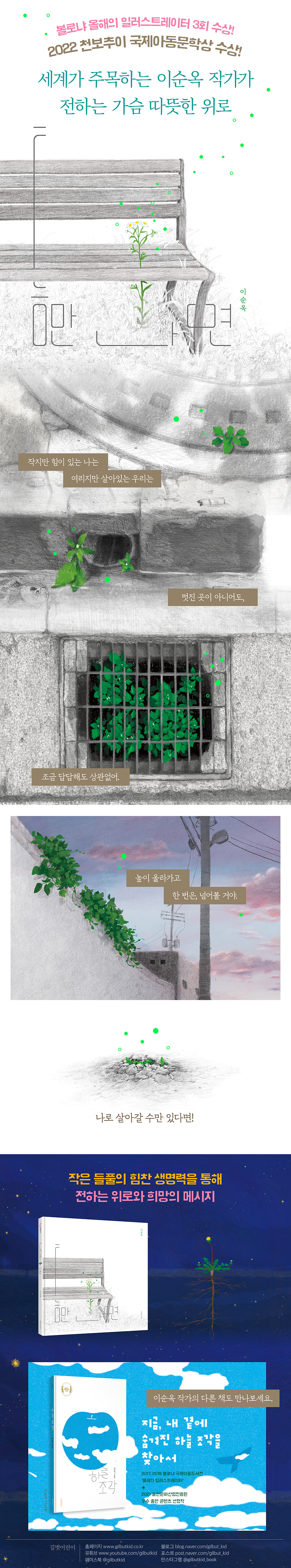 이 책에서 검은 아스팔트 바닥과 인공적인 회색빛 건물 사이에 빼꼼히 고개를 내밀고 있는 들풀은 싱그럽기 그지없습니다. 작은 틈만 나도, 멋진 곳이 아니어도, 나를 위한 자리가 아니더라도 굴하지 않고 작은 생명들은 씩씩하게 자라납니다.