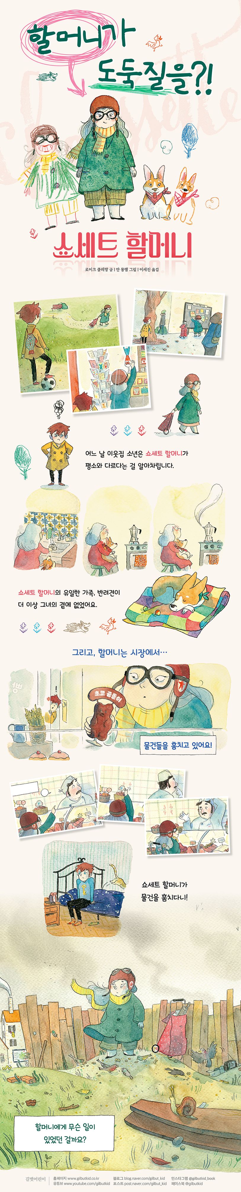 이웃집 소년 메를랭이 쇼세트 할머니의 뒤를 쫓을수록 할머니가 수상한 행동을 하는 이유가 점점 궁금해집니다. 《쇼세트 할머니》는 마침내 메를랭이 할머니의 비밀을 알게 되는 흥미진진한 이야기를 따라, 보고만 있어도 덩달아 웃음 짓게 되고 결국엔 눈물을 흘리고야 마는 아름답고 슬픈 이야기입니다, 평범하지만 서로에게 기대어 하루하루를 살았던 쇼세트 할머니와 다고베르의 행복했던 일상이 가득한 이야기를 읽으며, 이웃의 기쁨과 슬픔을 공감하고 이해하게 되는 따듯한 순간을 만나 보세요.