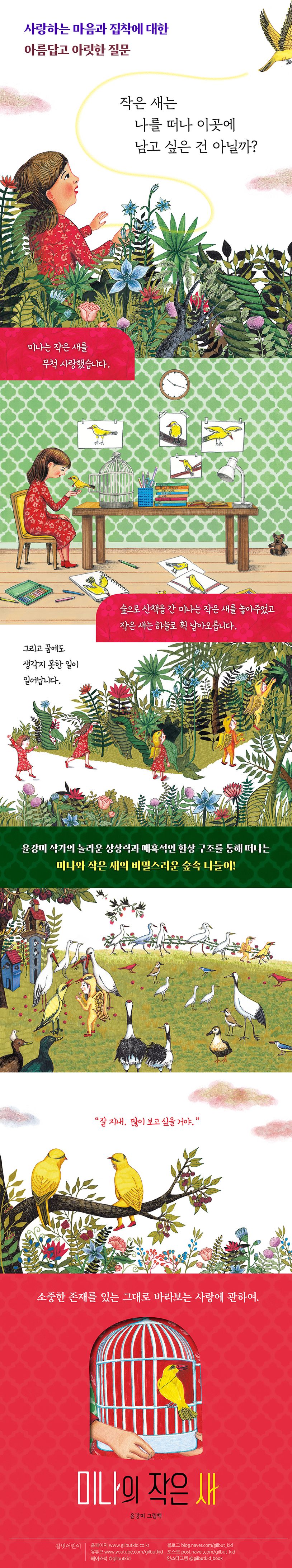 《미나의 작은 새》는 매혹적인 그림들이 한 편의 꿈처럼 펼쳐지고, 윤강미 작가는 환상 구조를 통해 일상에서 만날 수 없는 신비하고 아름다운 세계로 우리를 초대합니다. 미나는 새장의 문을 열고 작은 새를 세상으로 날려 보내며 진정한 사랑에 대해 깨닫습니다. 각자의 마음속에 자리한 작은 새를 떠올려 보며 소중한 존재를 사랑하는 방법에 대해 생각해 보게 하는 그림책 《미나의 작은 새》입니다.