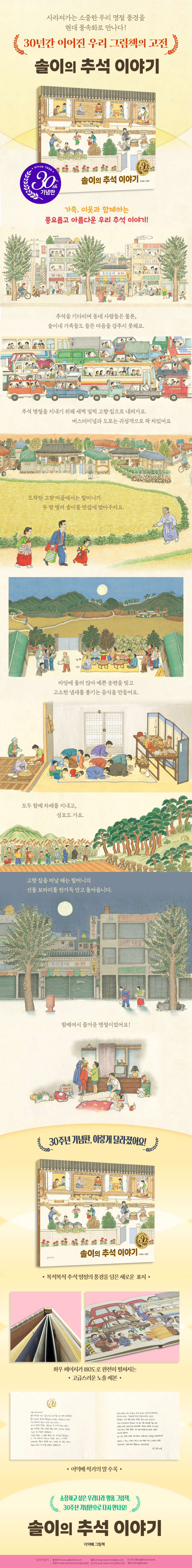 이번 30주년 기념판은 새로운 표지 디자인과 노출 제본, 고급스러운 양장 표지로 제작되어 책의 물성을 한층 살렸으며, 좌우 페이지가 180도로 펼쳐져 그림을 온전히 감상할 수 있습니다. 또한 오랜 시간 《솔이의 추석 이야기》를 아껴 온 독자들에게 감사의 마음을 전하는 작가의 말도 수록했습니다. 이제 고향의 푸근함과 가족의 사랑, 이웃들의 정과 함께 나누는 우리의 아름다운 전통이 담겨 있는 《솔이의 추석 이야기》 30주년 기념판을 소장해 보세요!